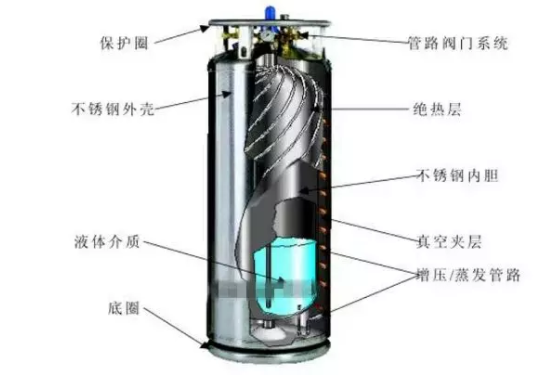 上部有保護圈、管路閥門系統,中間瓶體呢有不銹鋼外殼、絕熱層,里面有不銹鋼內膽、真空夾層,最里邊就是裝的液體介質,底部有增壓/蒸發管路、底圈。
